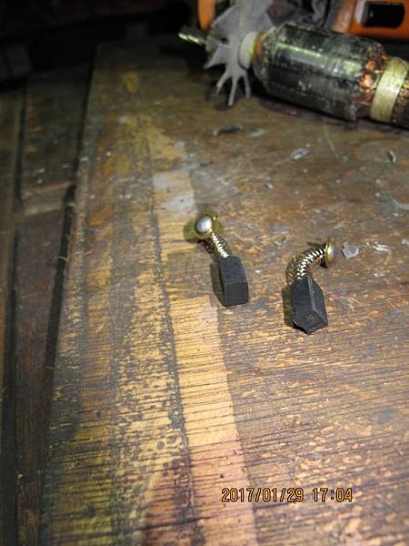 01-初步看外觀,都還算正常,所以先拆碳刷來看,雖然一開始有卡住的現像,取出後很平整、無破損,可以繼續整理,整理機器的標準動作已經建立了,一律先檢查碳刷、拆機檢視、清潔灰塵、上油、再裝機測試,跟著就可以插電測試,沒問題就能交差了。 |